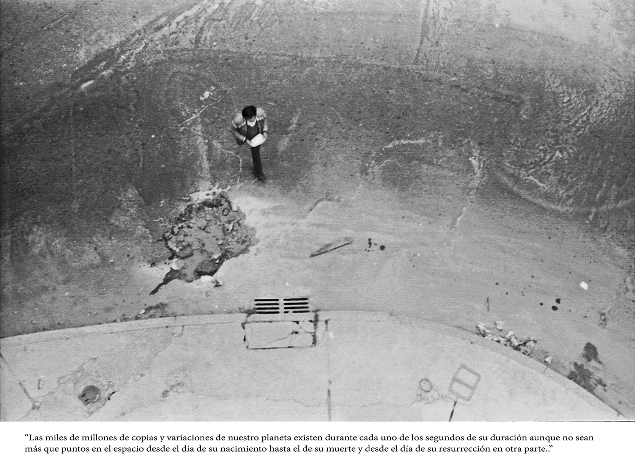 "Blanqui abarrota de infinitas repeticiones, no sólo el tiempo, sino también el espacio infinito. Imagina que hay en el universo un número infinito de facsímiles del planeta y de todas sus variantes posibles. Cada individuo existe igualmente en infinito número ejemplares, con y sin variaciones.