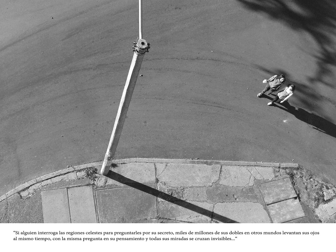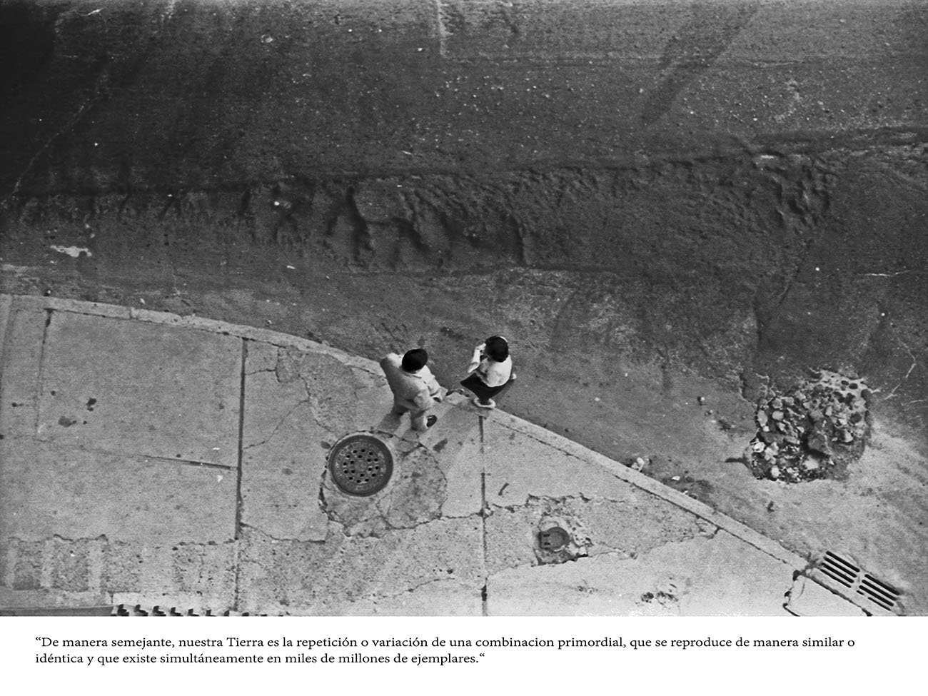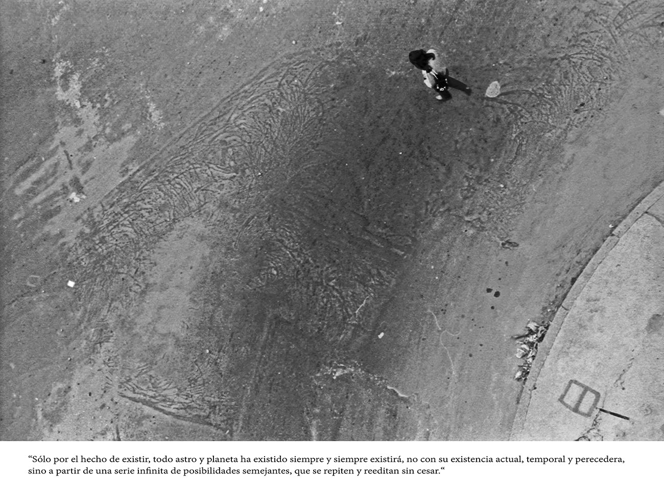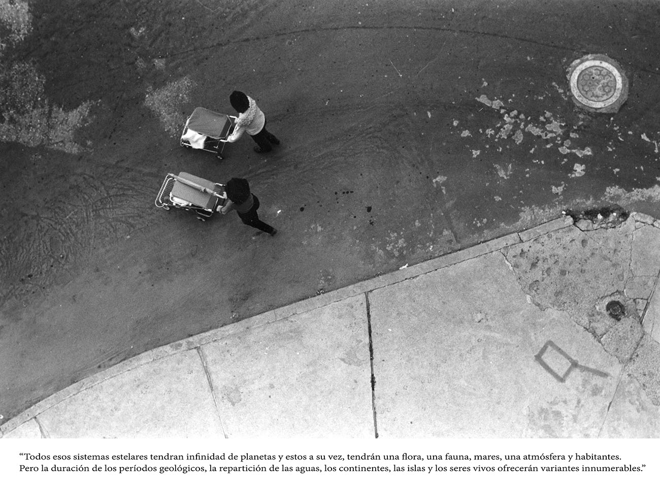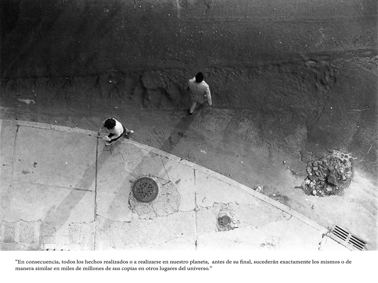 Muchos años después leí el libro La eternidad a través de los astros, una hipótesis astronómica de Louis Auguste Blanqui. El libro fue escrito por este controvertido autor mientras estaba en prisión y fue publicado en 1872. Propone una teoría poética del eterno retorno a partir de una infinita multiplicidad de tiempos y espacios en mundos posibles que contienen dobles de todos los seres por lo que concluye que todo ser humano a partir de esta conjetura, es un ser eterno en cada uno de los segundos de su vida a partir de las repeticiones y variaciones de su existencia en todo el universo. Es inevitable pensar en Blanqui creando un modelo del universo basado en la repetición como una compensación mental a su prolongado encierro en la prisión y un cierto consuelo de redención y eternidad de su propia existencia en la misma. Tal vez por esto el texto me conmovió. Decidí entonces, acompañar las fotografías con fragmentos del texto de Blanqui. Me gustó la idea de contrastar las imágenes de la cotidianidad de las personas del barrio que caminan en el andén o atraviesan la calle con la dimensión y escala cósmica del texto de Blanqui. Me parece que la imagen y el texto se potencian mutuamente. De hecho Blanqui en varios párrafos compara los acontecimientos de las vidas individuales de los seres humanos con la eterna repetición y variación de los eventos que, en su especulación astronómica, definen el devenir de las estrellas y los planetas.