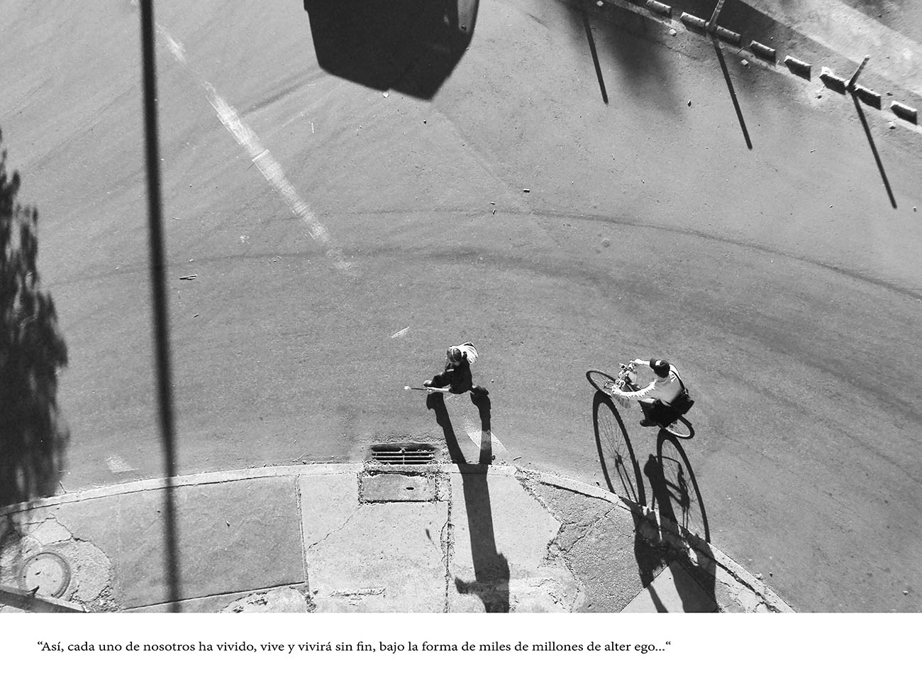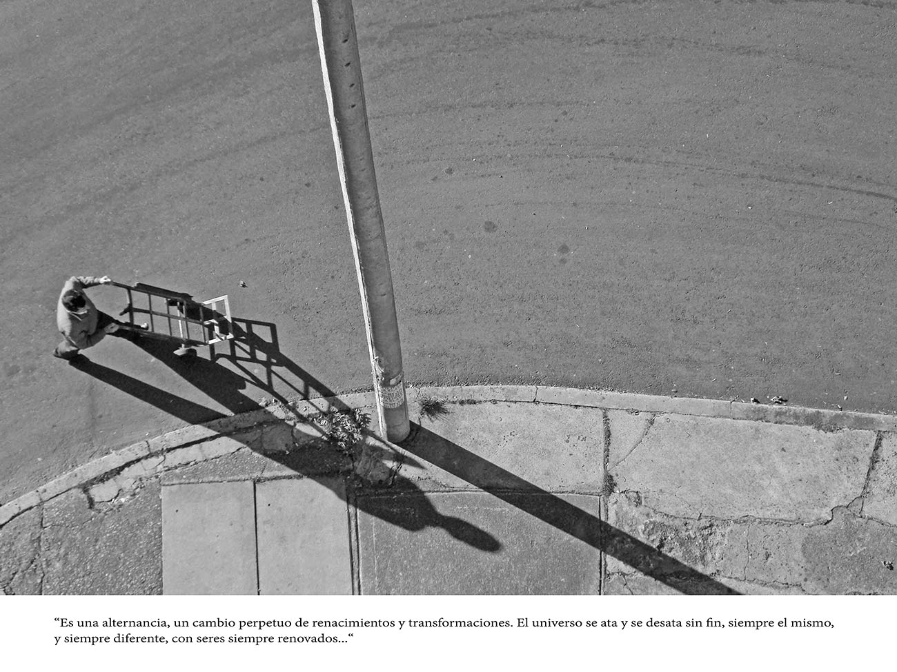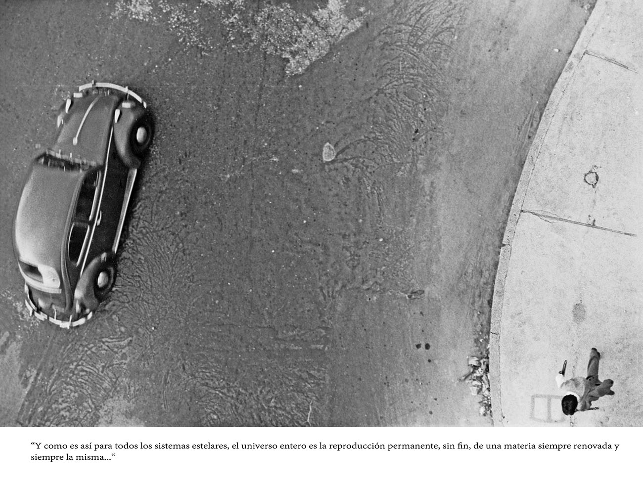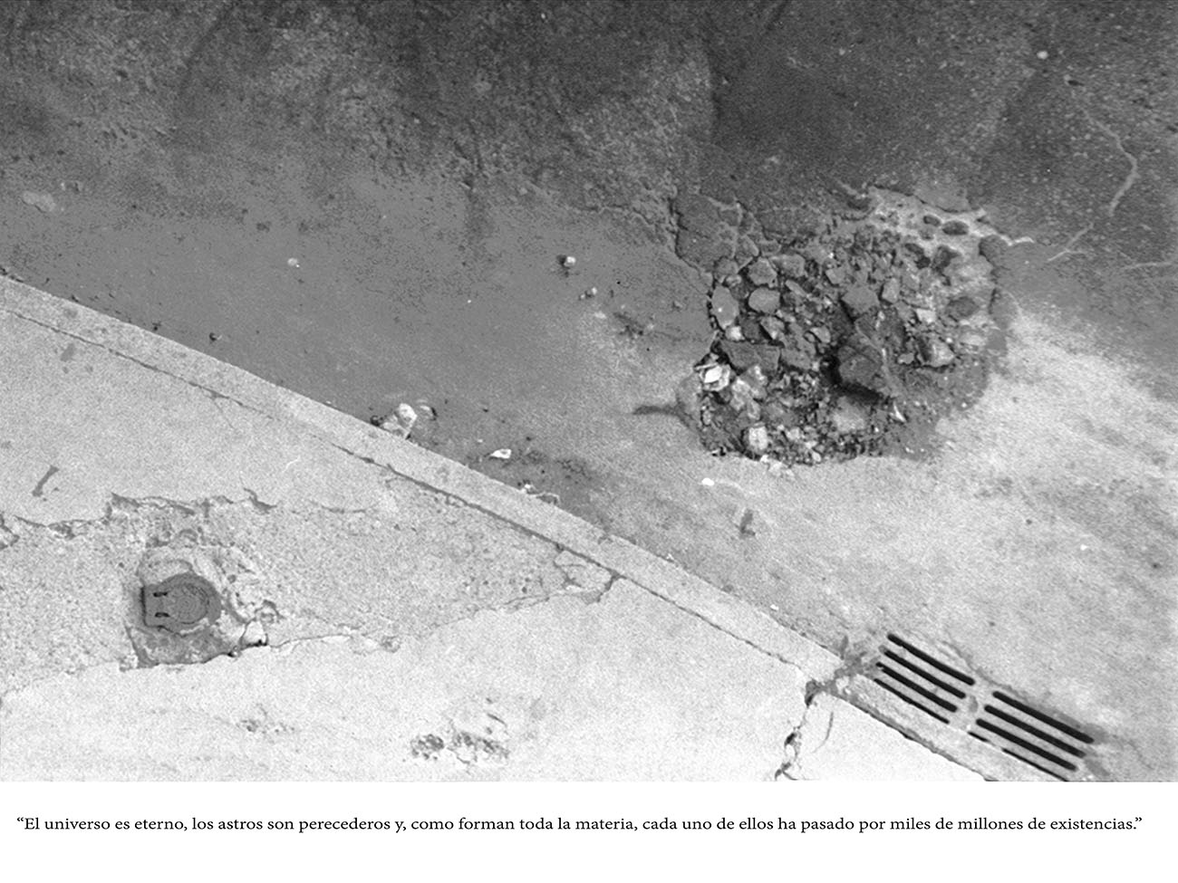 Muchos años después leí el libro La eternidad a través de los astros, una hipótesis astronómica de Louis Auguste Blanqui. El libro fue escrito por este controvertido autor mientras estaba en prisión y fue publicado en 1872. Propone una teoría poética del eterno retorno a partir de una infinita multiplicidad de tiempos y espacios en mundos posibles que contienen dobles de todos los seres por lo que concluye que todo ser humano a partir de esta conjetura, es un ser eterno en cada uno de los segundos de su vida a partir de las repeticiones y variaciones de su existencia en todo el universo. Es inevitable pensar en Blanqui creando un modelo del universo basado en la repetición como una compensación mental a su prolongado encierro en la prisión y un cierto consuelo de redención y eternidad de su propia existencia en la misma. Tal vez por esto el texto me conmovió. Decidí entonces, acompañar las fotografías con fragmentos del texto de Blanqui. Me gustó la idea de contrastar las imágenes de la cotidianidad de las personas del barrio que caminan en el andén o atraviesan la calle con la dimensión y escala cósmica del texto de Blanqui. Me parece que la imagen y el texto se potencian mutuamente. De hecho Blanqui en varios párrafos compara los acontecimientos de las vidas individuales de los seres humanos con la eterna repetición y variación de los eventos que, en su especulación astronómica, definen el devenir de las estrellas y los planetas.