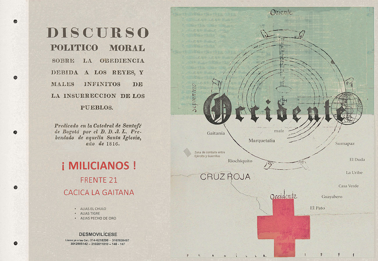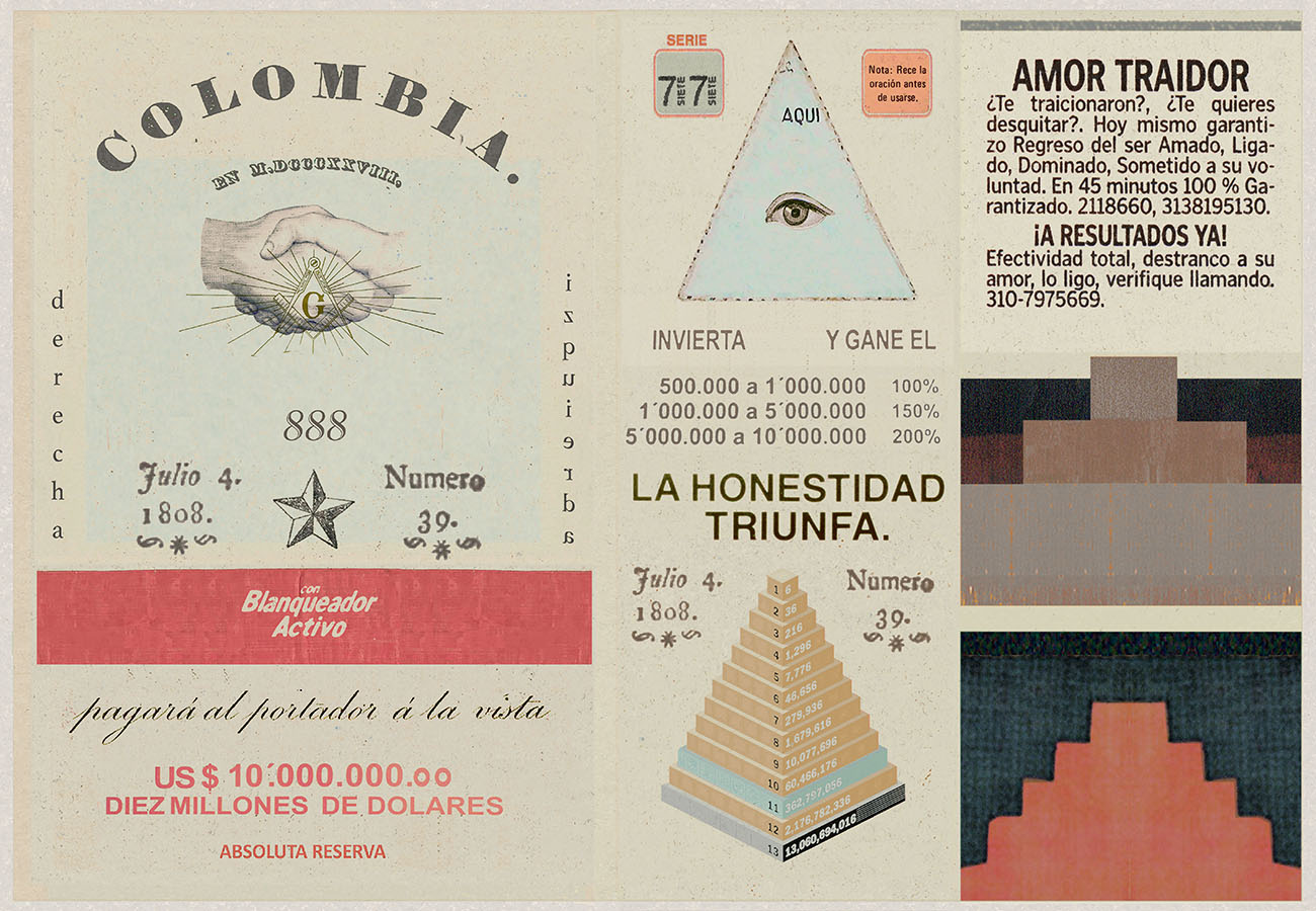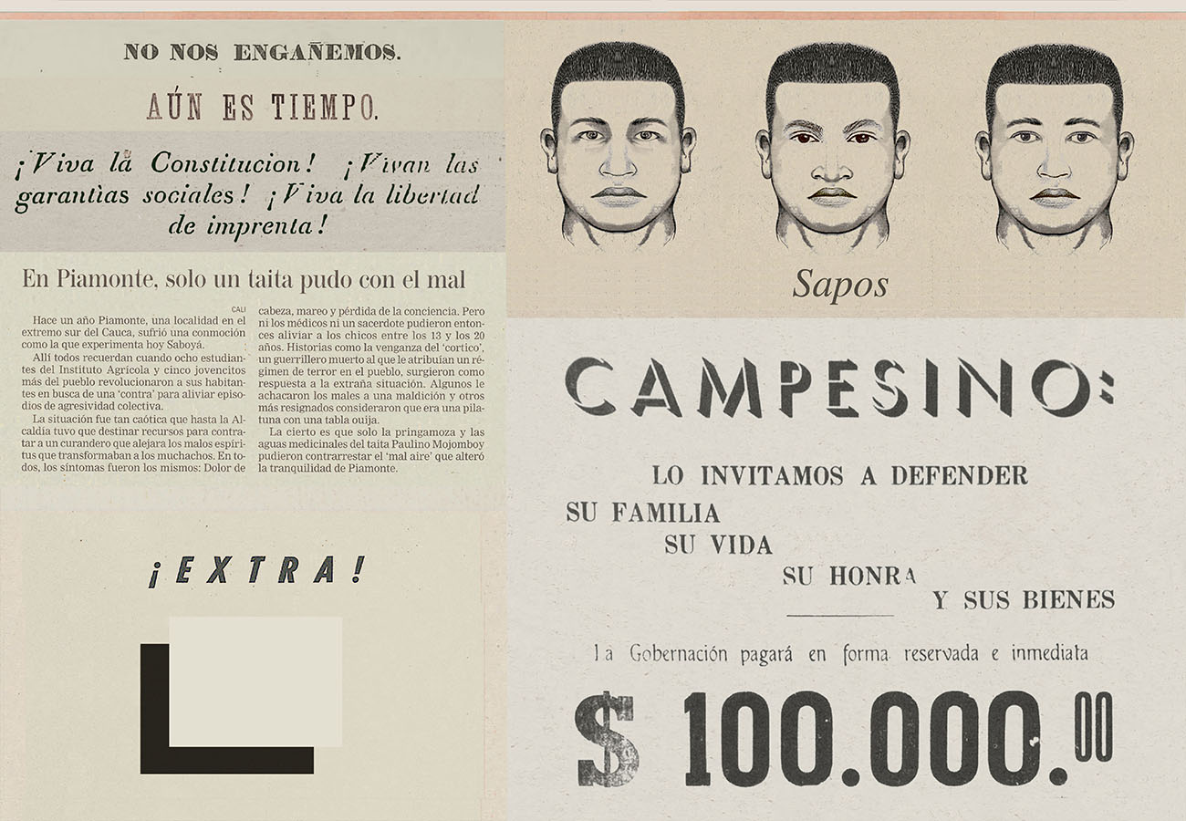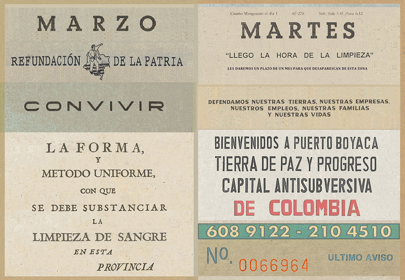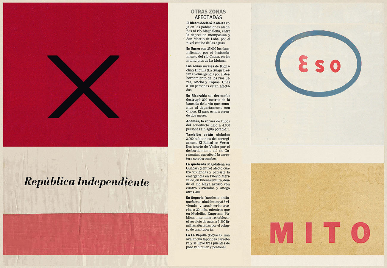 Esta serie pone en contiguidad estratos de información proveniente de distintas fuentes y tiempos. La operación es simple y muy conocida. El desplazamiento y el choque por contiguidad de lo que proviene de distintos contextos buscando juegos de sentido. En este caso, fragmentos de frases, titulares de prensa, nombres de periódicos colombianos de distintas épocas, documentos históricos, pasquines y panfletos, volantes callejeros, mitos indígenas americanos e imágenes propias interactúan en estos nuevos contextos.