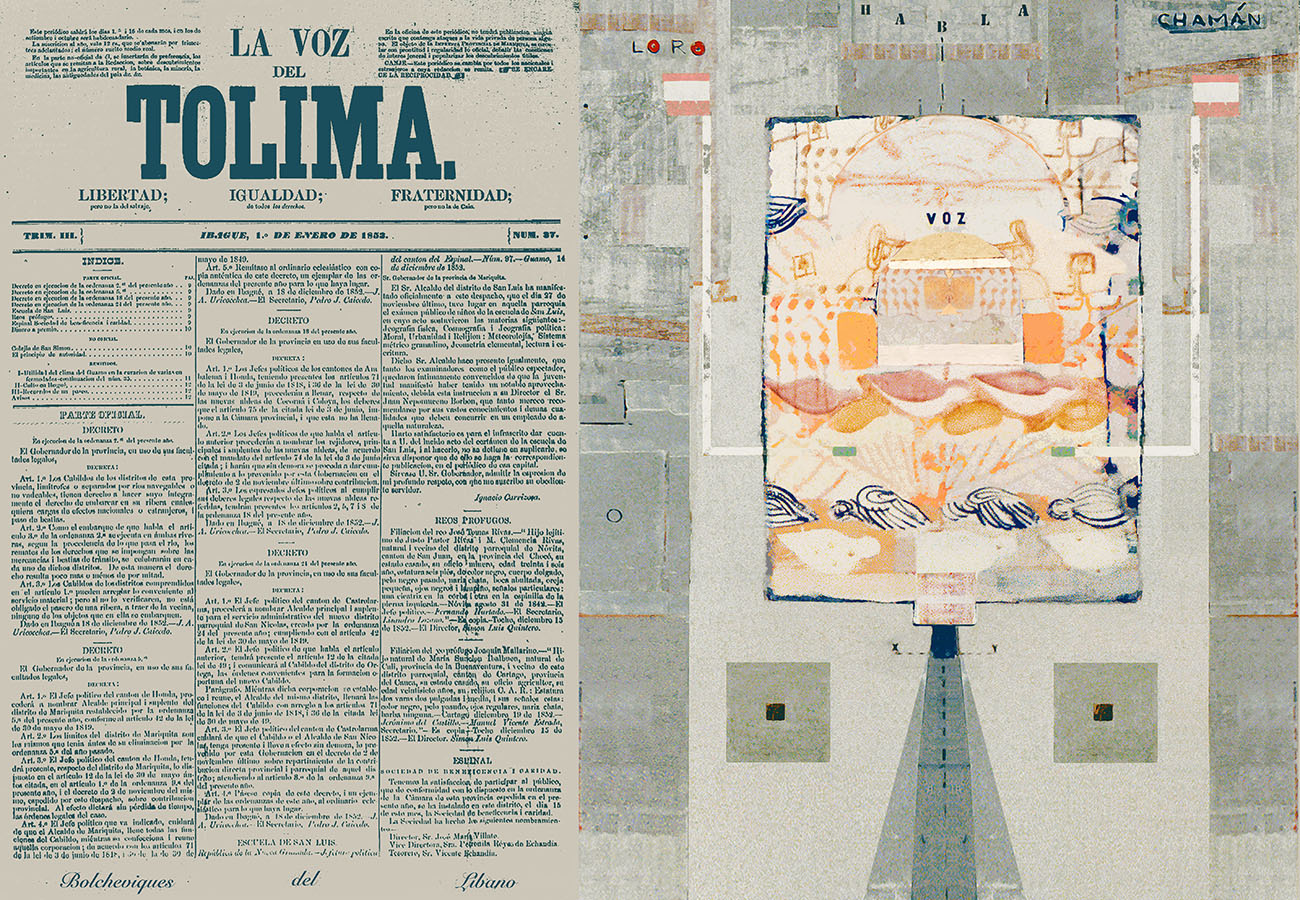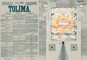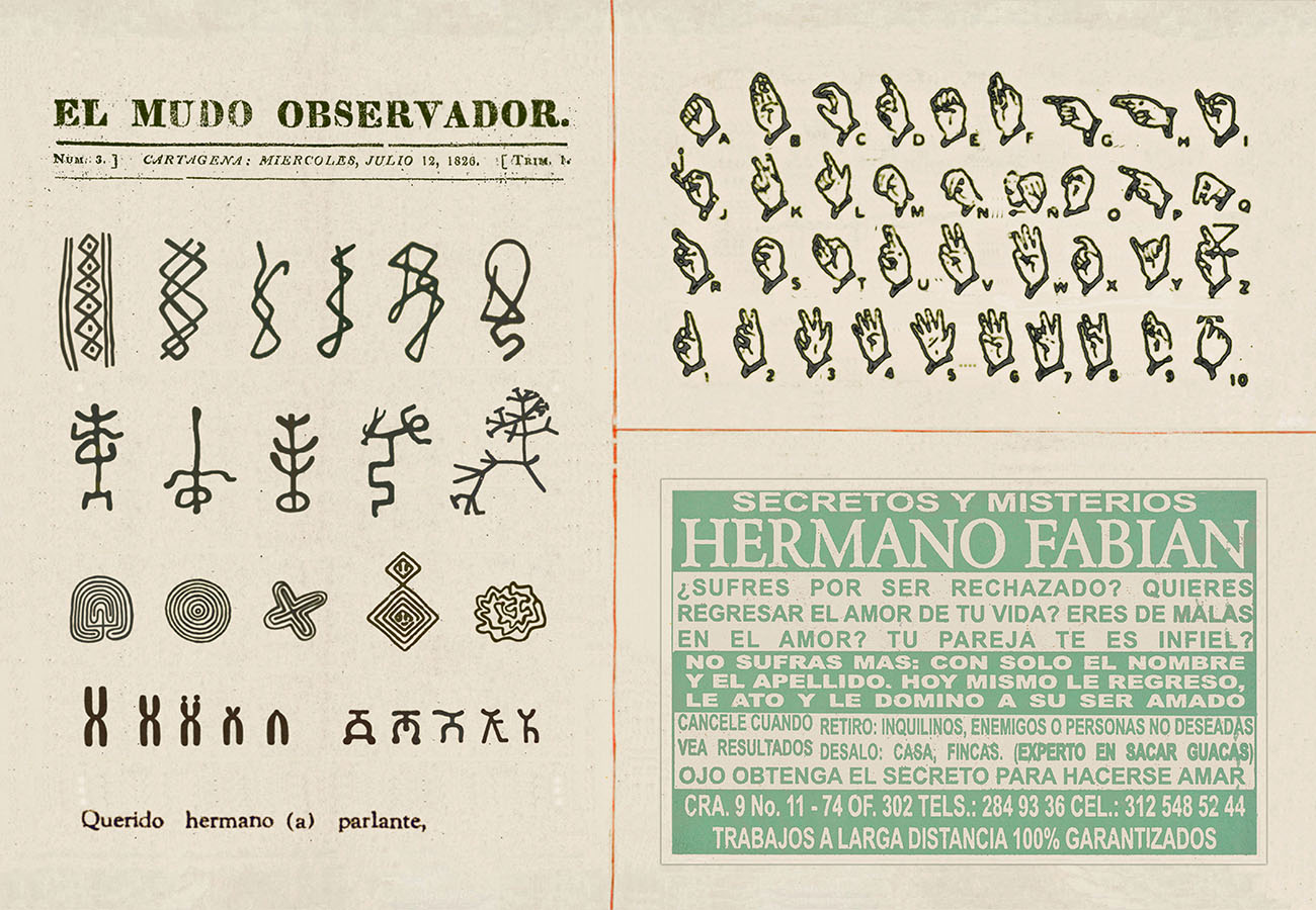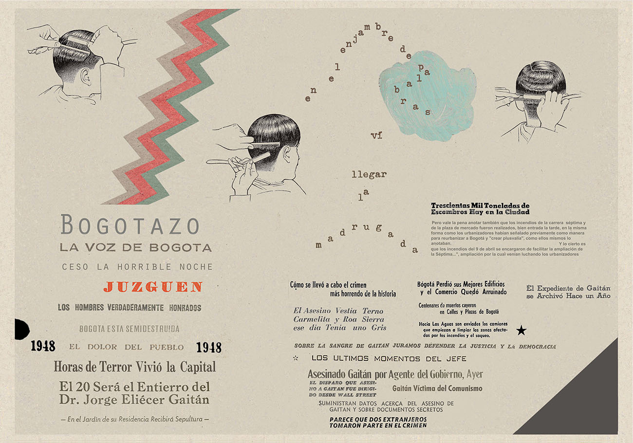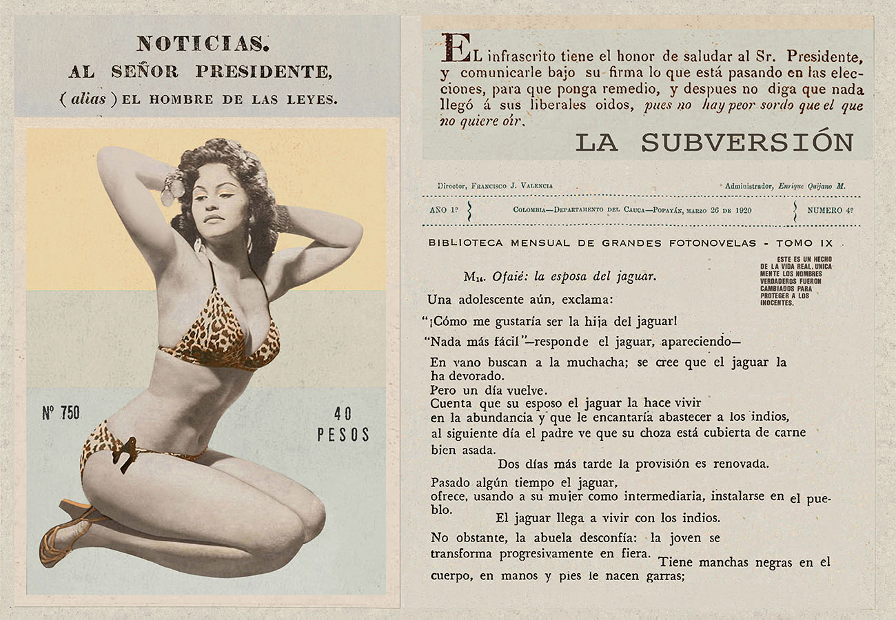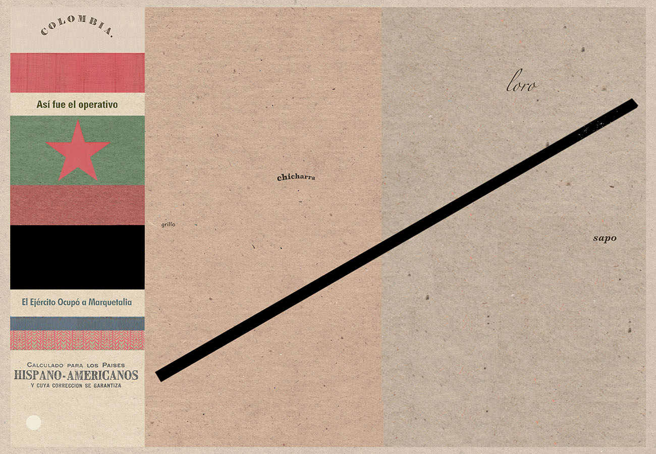 Esta serie pone en contiguidad estratos de información proveniente de distintas fuentes y tiempos. La operación es simple y muy conocida. El desplazamiento y el choque por contiguidad de lo que proviene de distintos contextos buscando juegos de sentido. En este caso, fragmentos de frases, titulares de prensa, nombres de periódicos colombianos de distintas épocas, documentos históricos, pasquines y panfletos, volantes callejeros, mitos indígenas americanos e imágenes propias interactúan en estos nuevos contextos.