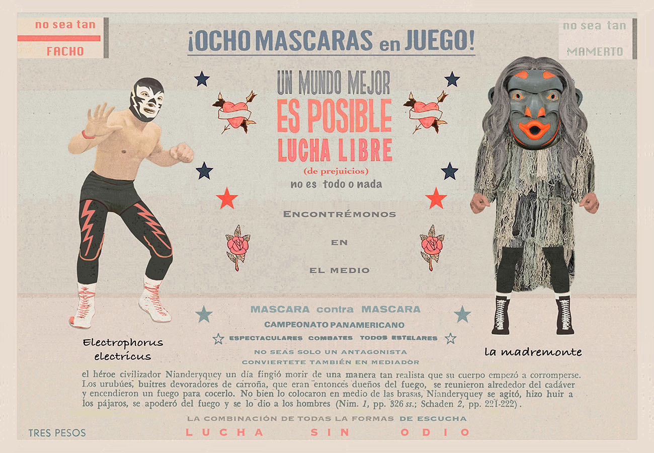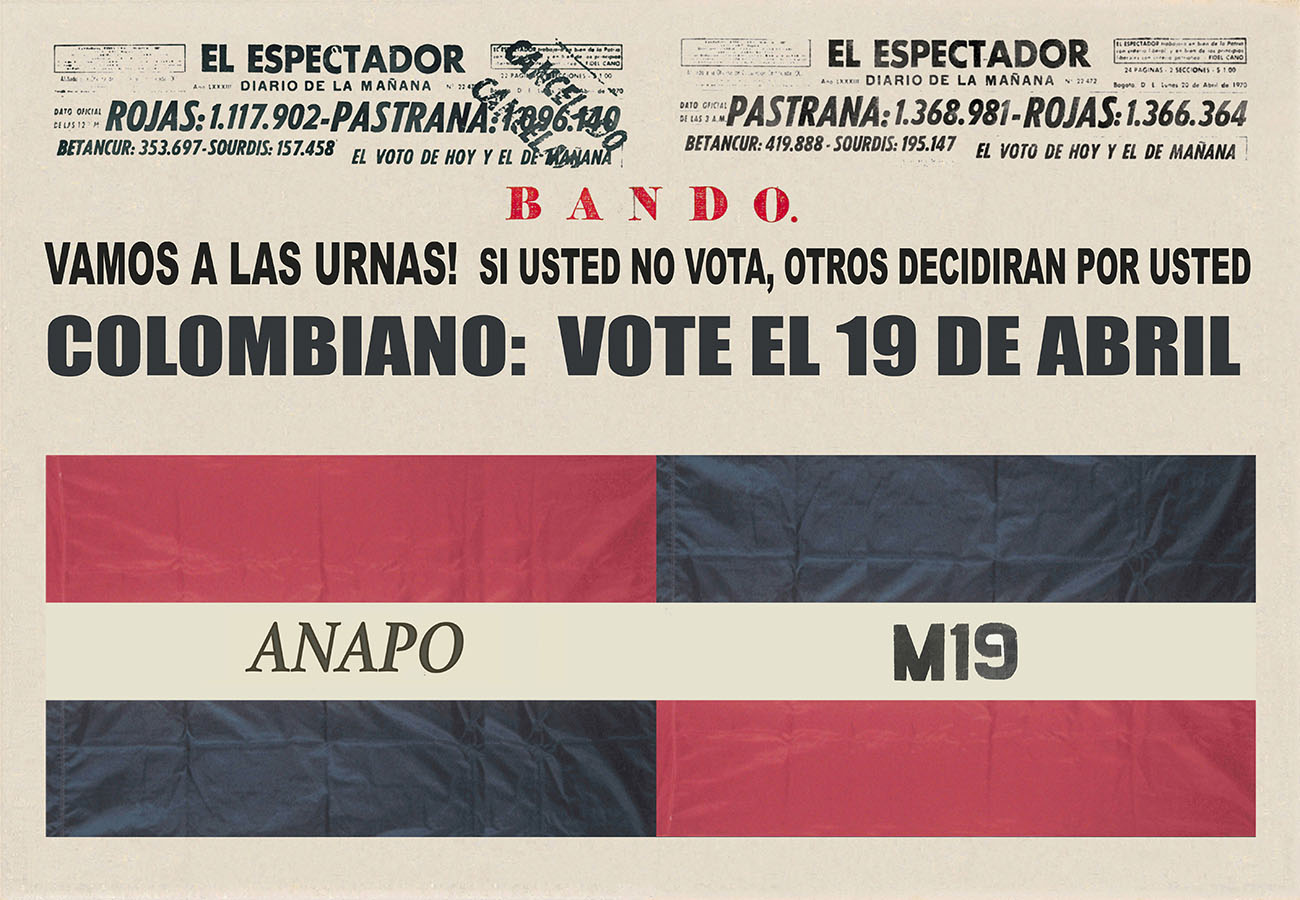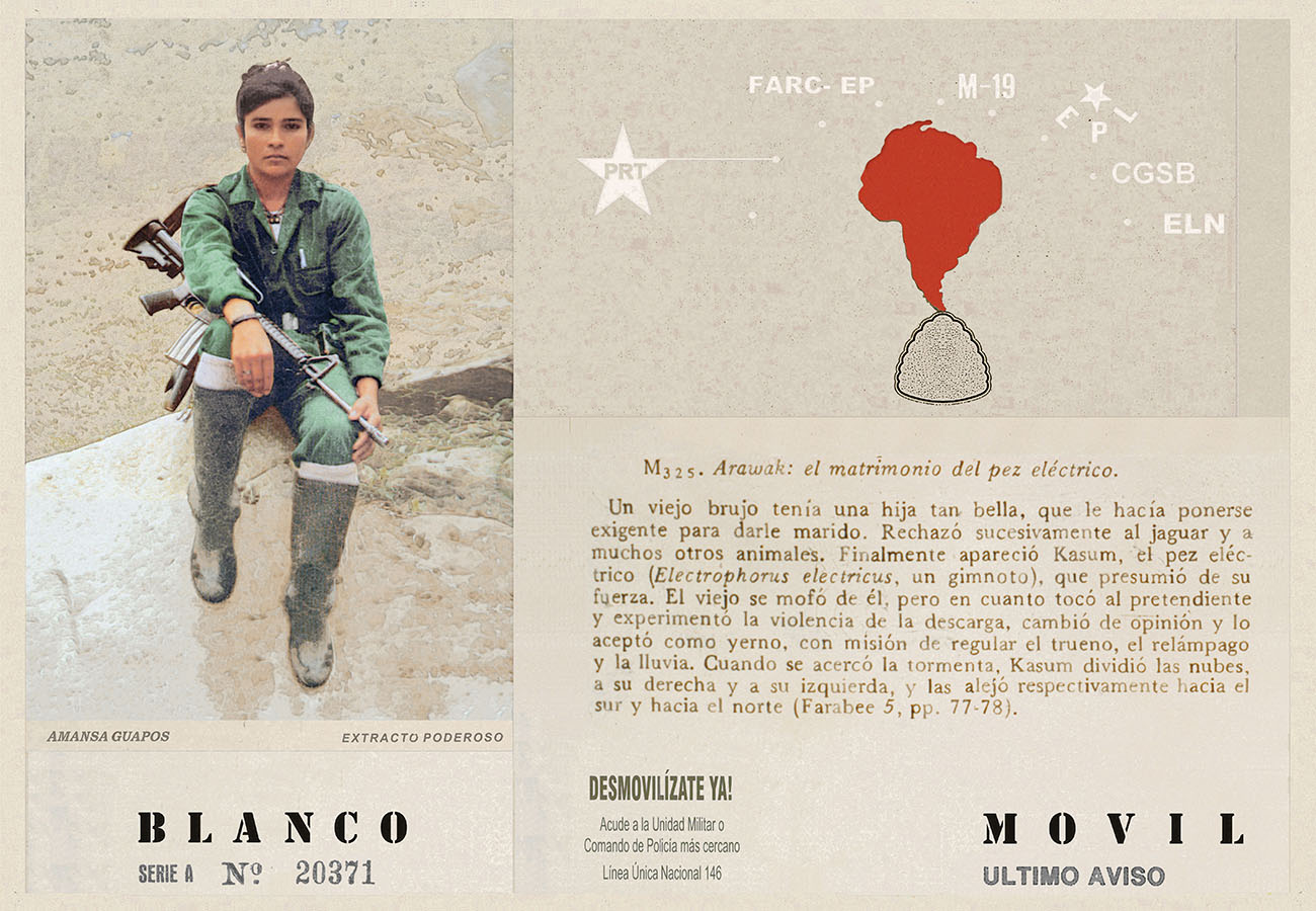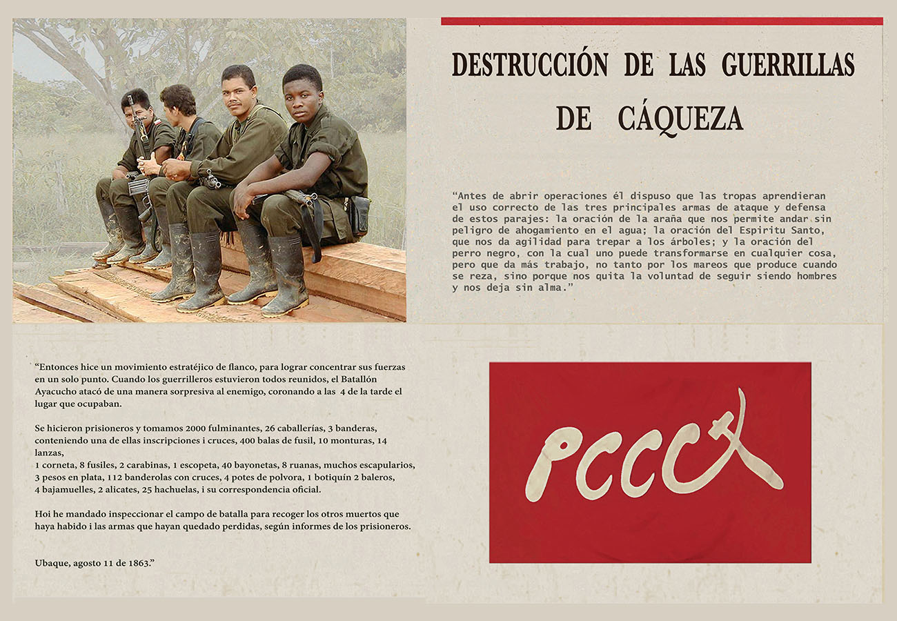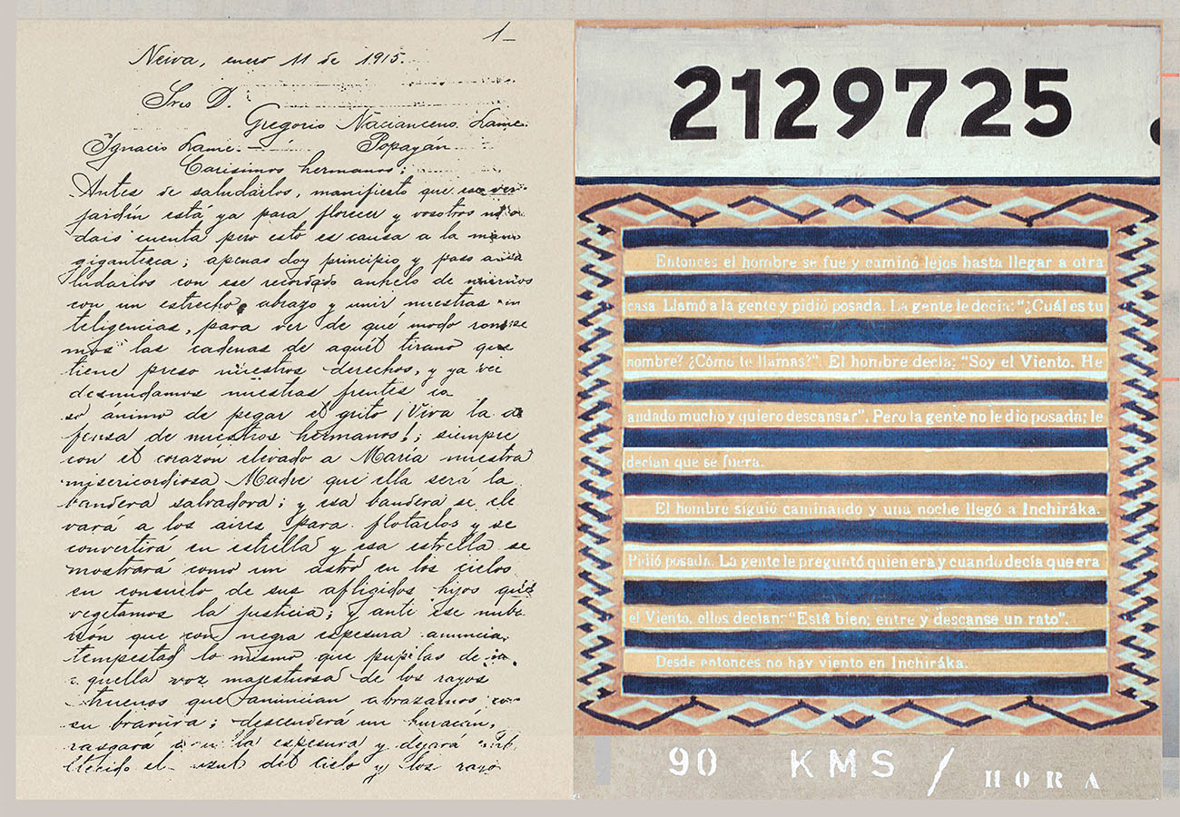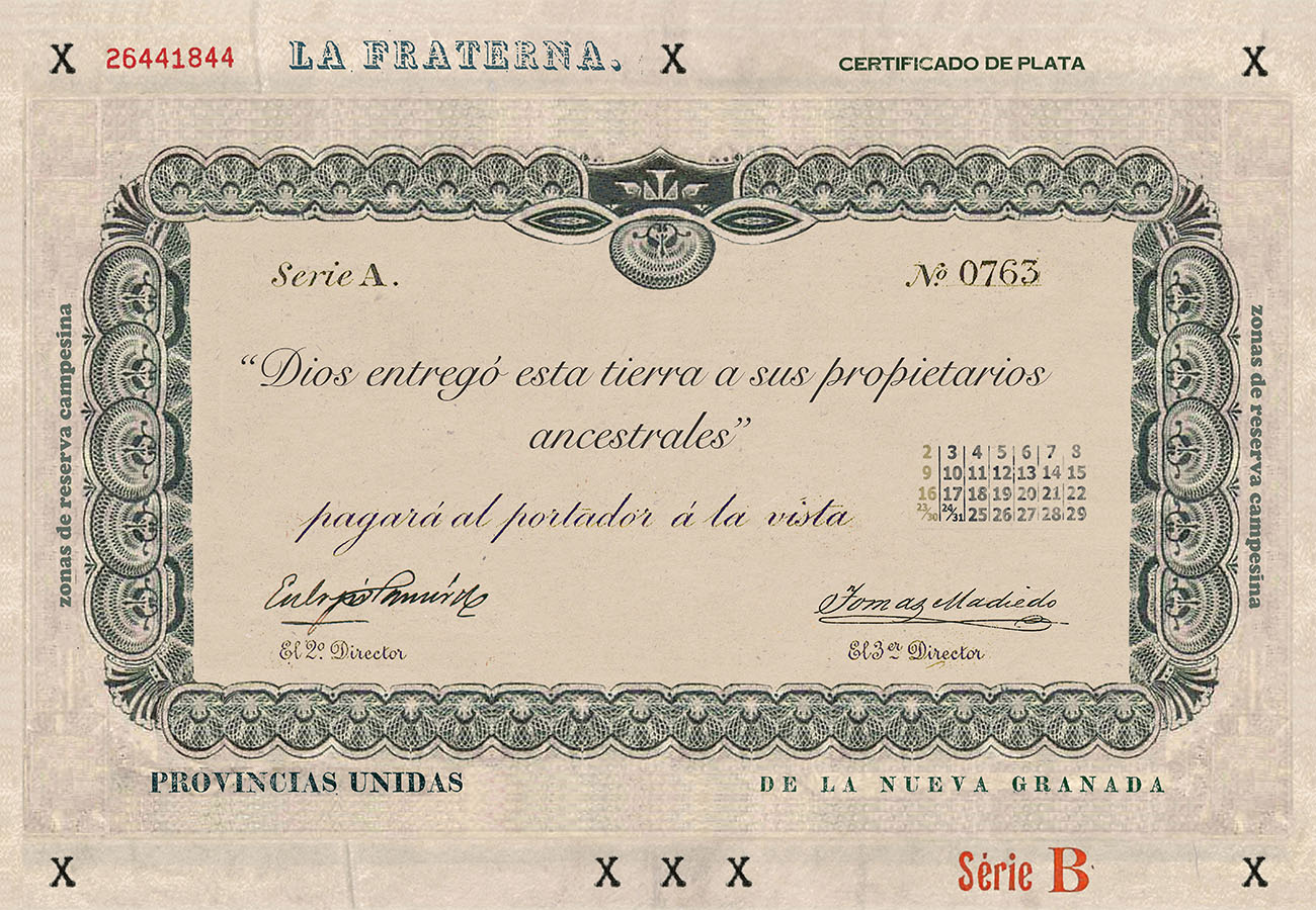 Esta serie pone en contiguidad estratos de información proveniente de distintas fuentes y tiempos. La operación es simple y muy conocida. El desplazamiento y el choque por contiguidad de lo que proviene de distintos contextos buscando juegos de sentido. En este caso, fragmentos de frases, titulares de prensa, nombres de periódicos colombianos de distintas épocas, documentos históricos, pasquines y panfletos, volantes callejeros, mitos indígenas americanos e imágenes propias interactúan en estos nuevos contextos.